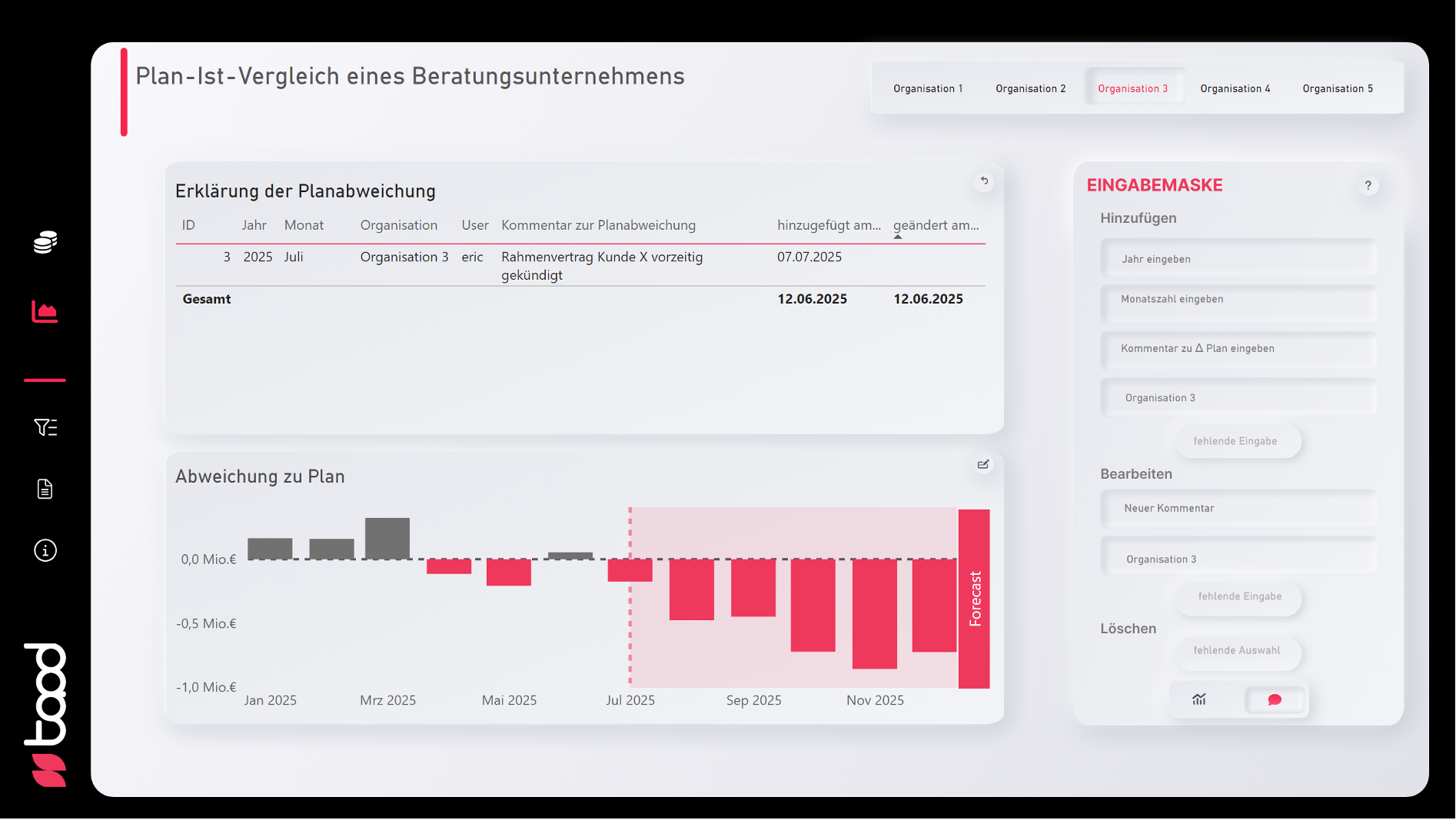 In der integrierten Eingabemaske können Anwender Forecast-Werte direkt im Dashboard erfassen, sei es für einzelne Organisationseinheiten, spezifische Monate oder Gesamtperioden. Die Eingaben werden zentral gespeichert, wodurch sich der ständige Wechsel zwischen BI-Tool, Excel und ERP-System erübrigt.